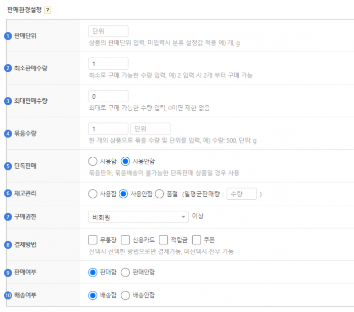 묶음판매, 묶음 배송이 물가한 단독판매 상품일 경우 '사용함'에 선택합니다.