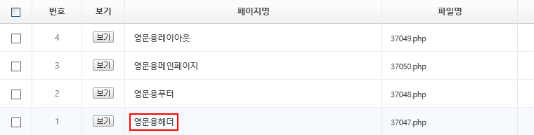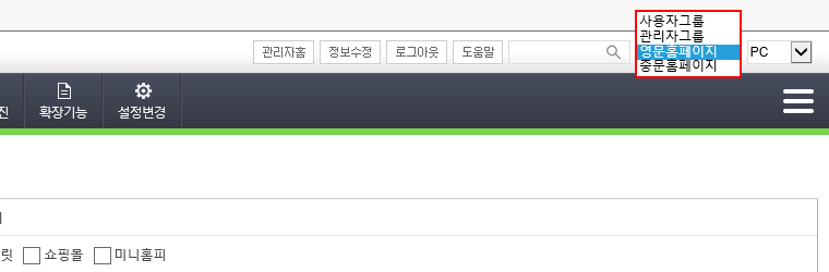 1) 페이지관리 > 우측상단의 GNB그룹 선택상자에서 영문홈페이지 선택