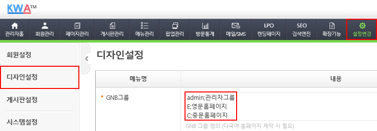 1) 설정변경 > 디자인설정 > GNB그룹 입력란에 코드명;그룹명 입력 후 저장