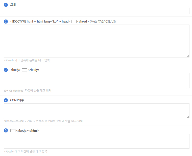 게시판을 구성하는 모든 페이지(목록,보기,쓰기,수정,삭제,답변)의 id="AB_contents" 다음에 넣을 태그내용을 입력하세요.