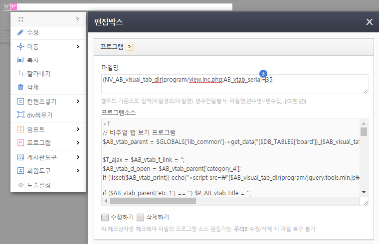 붙여넣은 비주얼탭 템플릿의 P아이콘 클릭 > 수정 > AB_vtab_serial=## 일련번호를 변경하세요.