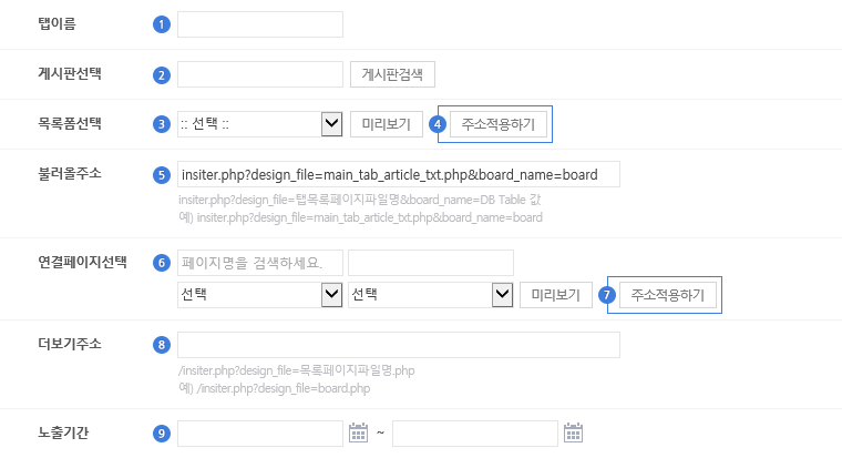 게시판 선택 후 '④주소적용하기'를 클릭하면 '⑤불러올주소'의 board_name=뒤에 적용됩니다.