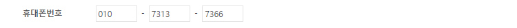 전화번호를 입력하는 입력상자가 3개로 분리되어 있는 형태로, 첫 번째 입력상자는 국번을 select 입력상자에서 선택하는 형태입니다.