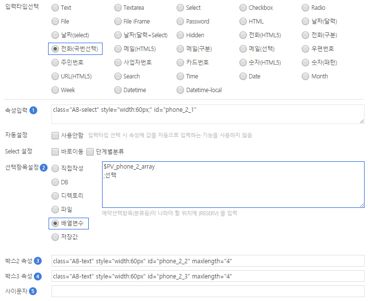 · PV_phone_2_array : 휴대전화를 입력할 때 사용합니다. (010, 011, ...)