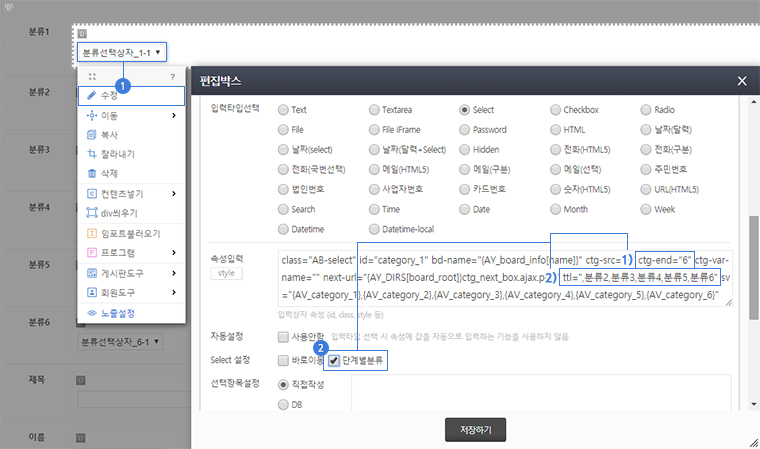 ② Select 설정에서 '단계별분류' 체크 > 속성입력에 자동으로 세팅된 내용 중 아래 내용 수정