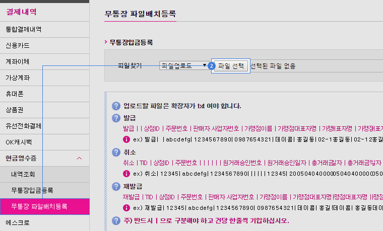 > 무통장 파일배치등록 클릭 > ①번에서 받은 현금영수증.txt 파일을 업로드 하세요.