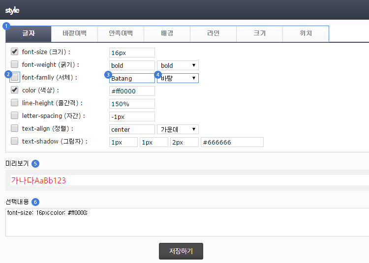 · color : 글자의 색상을 선택합니다. ▶ 색상선택 매뉴얼 바로가기