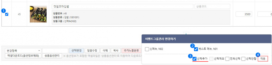 ② 추가할 이벤트 그룹 '베스트메뉴' 체크
