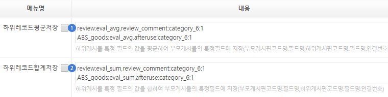 부모게시판코드명:평균필드명,하위게시판코드명:저장필드명:연결번호 형태로 입력하세요.