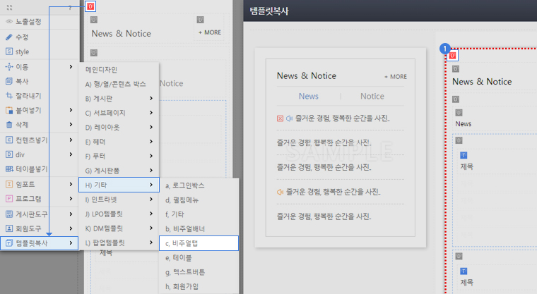 편집화면에서 좌측의 전체보기, 편집버튼노출에 체크 > D버튼 클릭 > 템플릿복사 > H) 기타 > c,비주얼탭 > 첫번째 비주얼탭 템플릿을 콘텐츠박스 단위로 복사 > 원하는 위치에 붙여넣으세요.