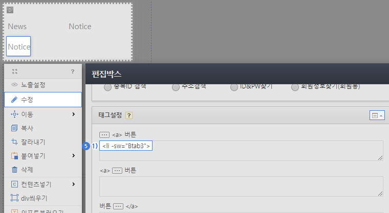 > 태그설정 토글 오픈 > -sw="Btab2" 내용 중 숫자부분을 현재 버튼 순서로 수정