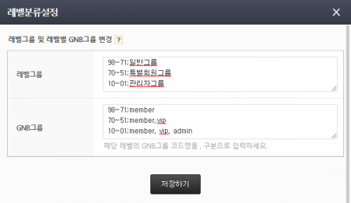 - 70~51; 특별회원그룹에 속하는 회원레벨은 member와 vip GNB그룹의 메뉴들만 권한설정을 할 수 있습니다.
