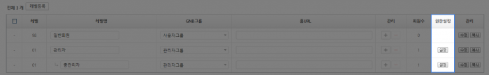 이렇게 설정한 후, 저장하시면 회원레벨관리에서 각 GNB그룹별로 권한설정을 할 수 있는 [설정]버튼을 확인할 수 있습니다.