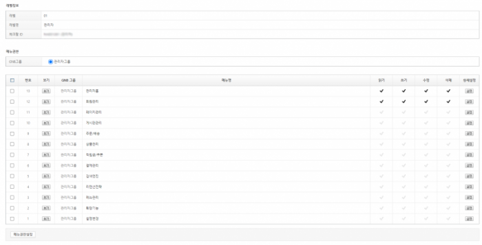 각 메뉴의 읽기/쓰기/수정/삭제에 체크(∨) 버튼을 클릭하시면 권한을 주거나, 권한을 해제할 수 있습니다.