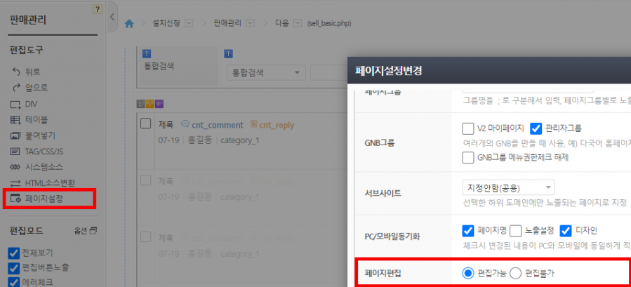 4. 저장하기를 클릭하였을 때 '편집할 수 없는 페이지입니다' 라는 문구가 뜰 경우 좌측의 페이지설정 - 페이지편집 설정을 편집 가능으로 수정 후 저장해주시면 편집이 가능합니다.