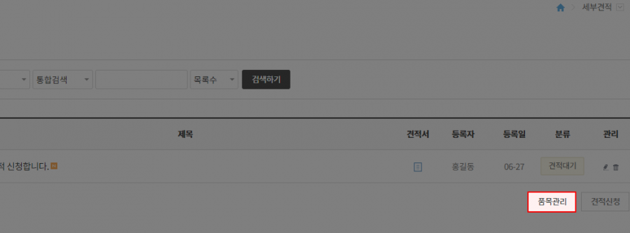 ① 제목 : 클릭 시 견적서를 확인할 수 있으며 품목의 수량을 직접 수정이 가능합니다.