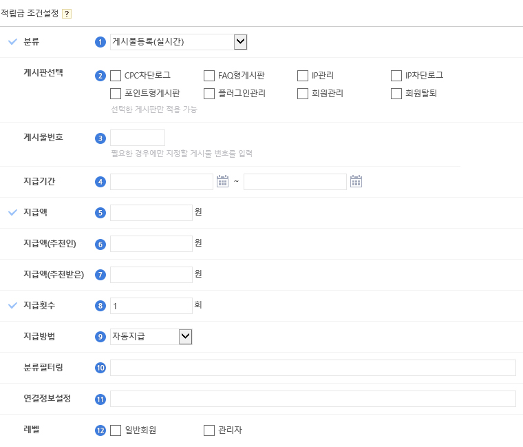 주의!! 분류필터링이 설정된 정책의 적립금 적립은 기존에 등록된 게시물도 지급회수 제한 개수에 포함됩니다.