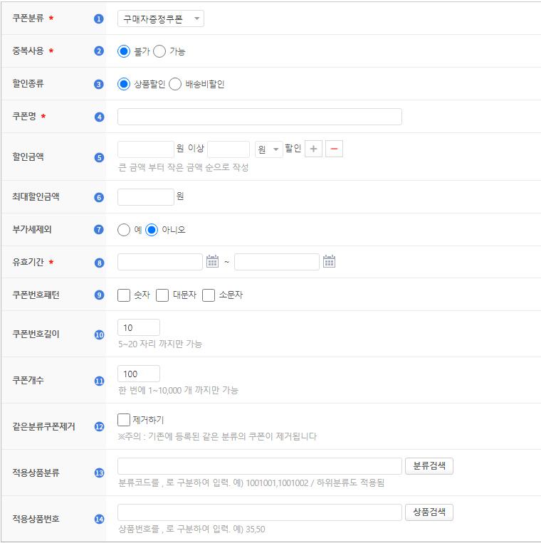 특정 상품분류에서만 이 쿠폰을 사용할 수 있게 하려면 상품분류코드를 입력하시고, 그렇지 않으면 비워두세요.