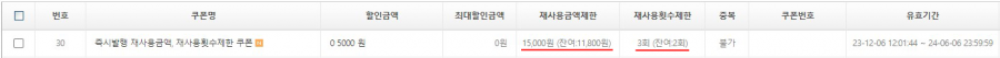 (원글에 사용자가 사용한 쿠폰의 이름, 재사용금액, 재사용횟수에 대한 정보를 확인할 수 있으며,