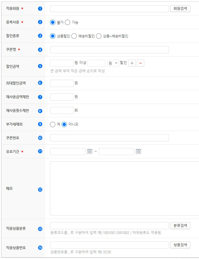 특정 상품에서만 이 쿠폰을 사용할 수 있게 하려면 상품번호를 입력하시고, 그렇지 않으면 비워두세요.