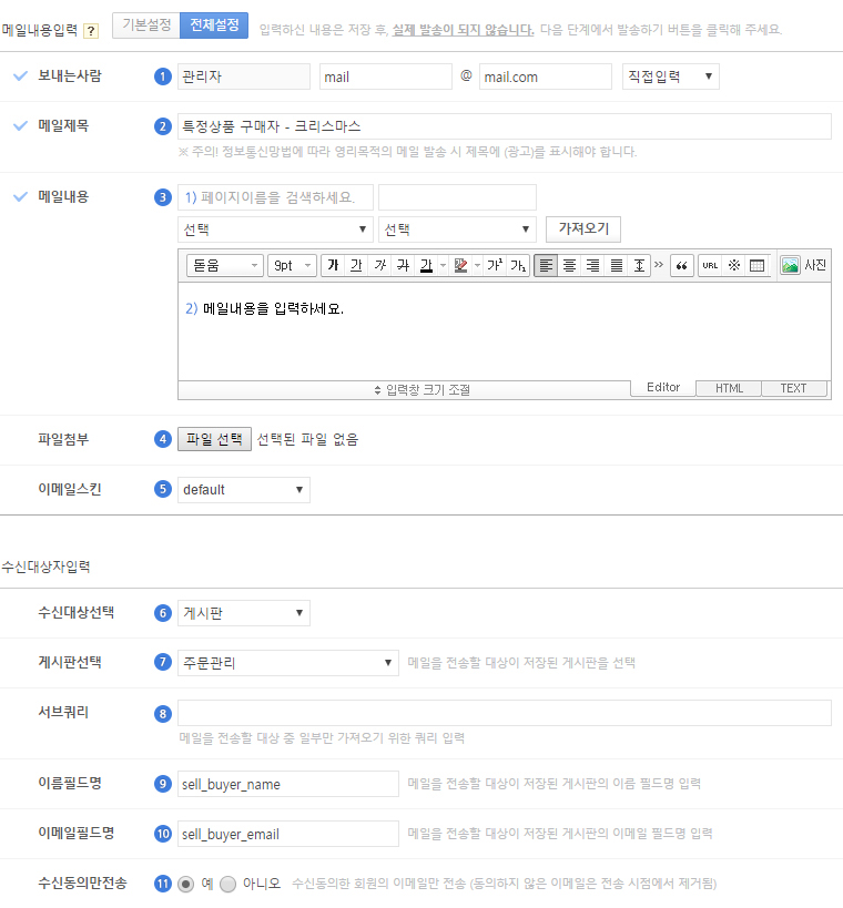 메일을 전송할 대상이 저장된 게시판의 이메일 필드명을 입력하세요. 예시) email
