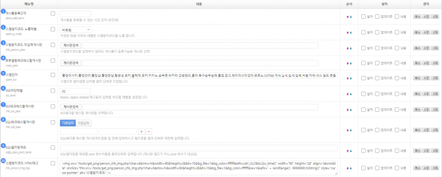 설정을 변경하려면 호스팅업체의 게시판스팸필터가 '사용안함'상태여야 합니다. (고객센터에 문의하시면 처리해드립니다.)