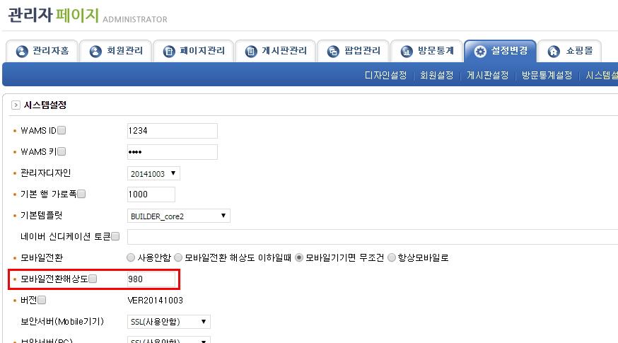 모바일전환 해상도는 설정변경 > 시스템설정 > 모바일전환해상도에 체크하신 다음 변경하실 수 있습니다.