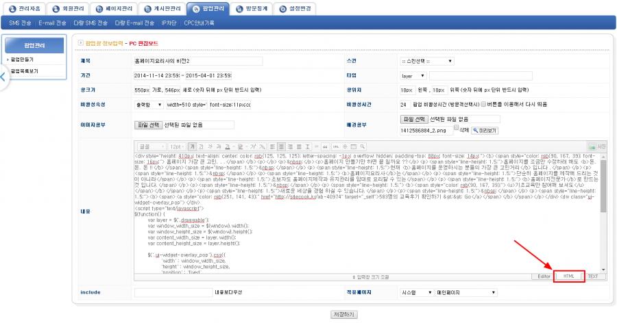 위 메뉴얼을 참고하여 팝업을 등록하는 페이지까지 들어갑니다.