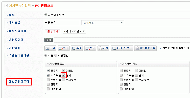 2. 게시물알림설정 > 게시물등록시 부분에서