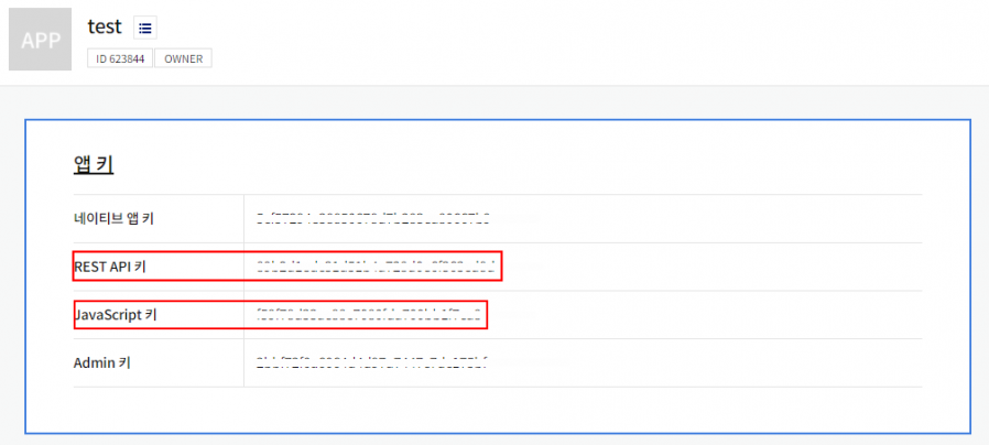 2. 발급받은 키 중에서 REST API 키와 JavaScript 키를 설정변경에 입력해 주세요.