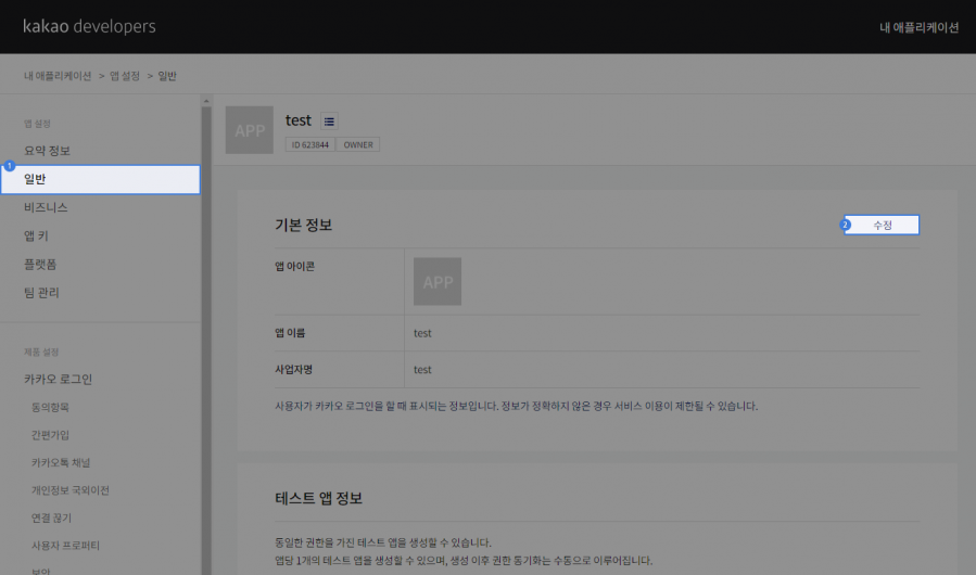 https://developers.kakao.com/apps 경로에서 내 애플리케이션 선택