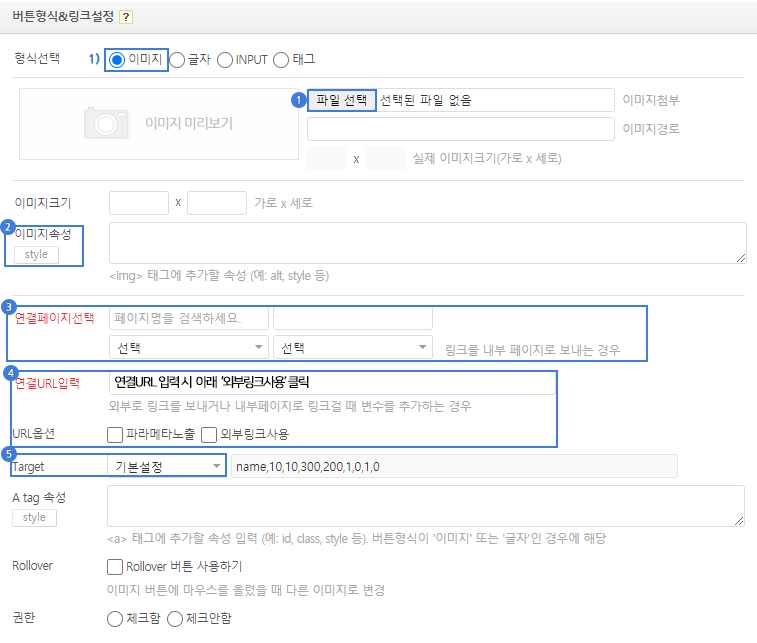 ① 버튼명 : 버튼으로 사용할 텍스트를 입력합니다.