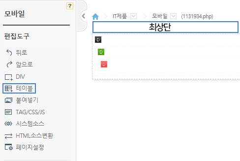 첫번째. 테이블을 넣을 DIV의 ① D 아이콘 클릭 > ② 테이블 넣기를 클릭합니다.