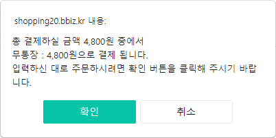 쇼핑몰에서 상품을 구매시, 주문자 정보와 결제 정보를 작성한 후 하단의 <결제하기>버튼을 클릭하면 아래와 같은 메시지가 뜹니다.