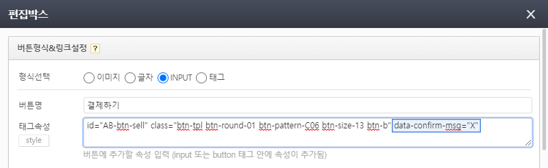 3. 버튼의 편집박스에서 '태그속성'항목에 있는 소스들 가장 끝에 data-confirm-msg="X" 을 넣으신 후, 저장해주세요.