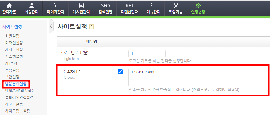▶ 관리자 홈 > 설정변경 > 방문통계설정 > 접속차단IP
