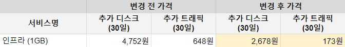 최근 BOS 인프라의 안정성이 확보되어 추가 디스크, 트래픽, 호스팅 가격을 인하하게 되었습니다.